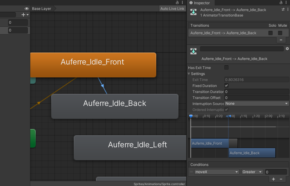 To create a transition, right click on the box, select "Create Transition" and then pull that arrow to the box you want to transition it to. Clicking on the line between the two animations will bring up the Transition details in the "Inspector" panel.