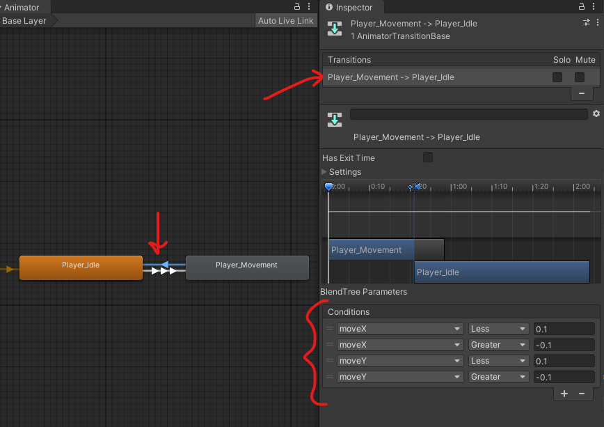 Set the animation default to the idle blend tree. You're going to create four individual transitions from idle to movement, and in each condition, set one of the variables.&#x20;